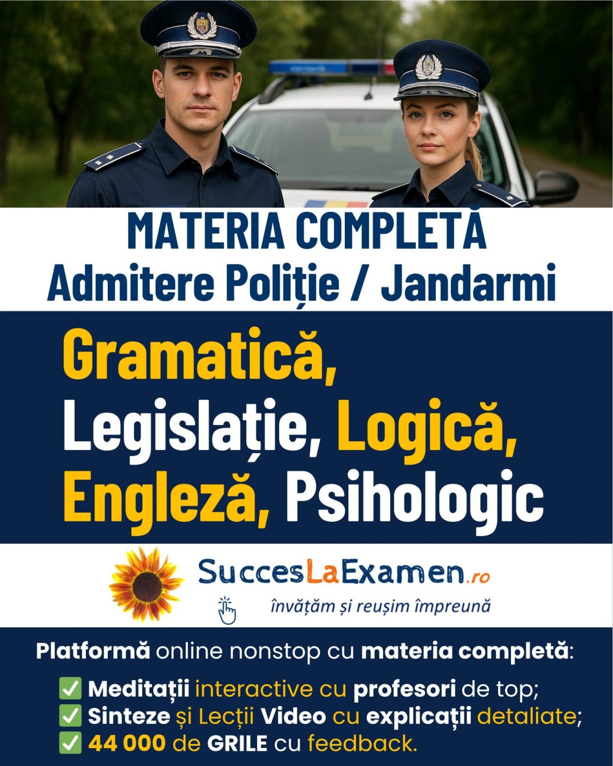 Pregătire Admitere Poliție, Jandarmi, ANP la Școala de Agenți de Poliție Câmpina / Cluj / Oradea și Școala de Subofițeri de Jandarmi 2026. Program creat și livrat de profesori reali, dedicați și experimentați, conform tematicii și bibliografiei oficiale. Pregătire completă, intensivă, interactivă la toate materiile necesare. Acces imediat la cursurile online de pe platformă. Cursul cu testarea psihologică se achită separat, cu o luna inainte de testarea psihologică.