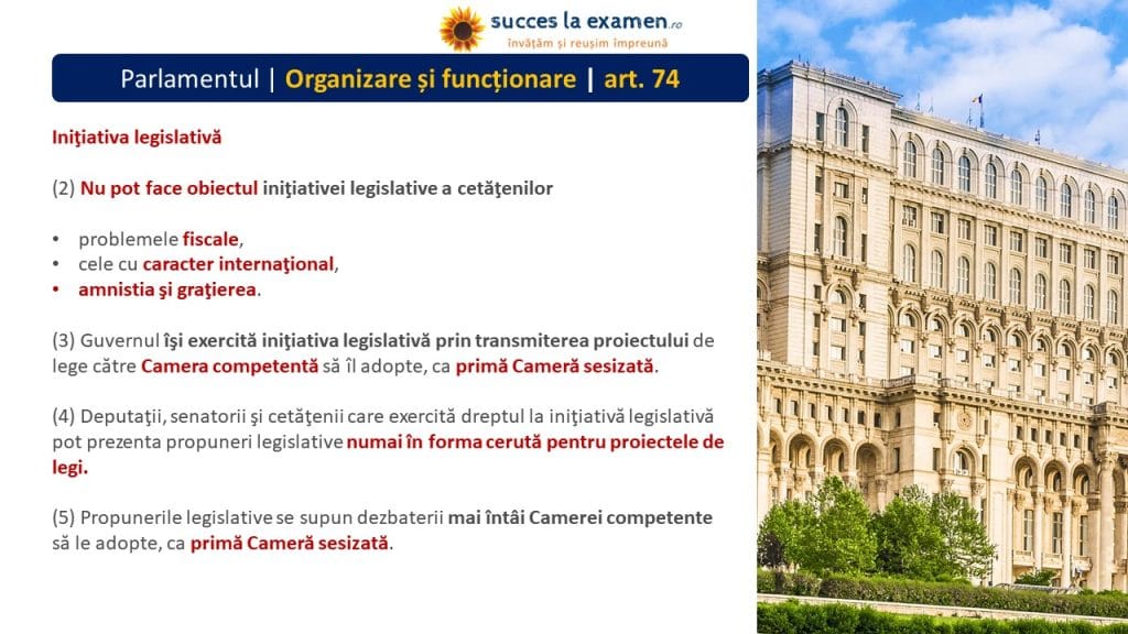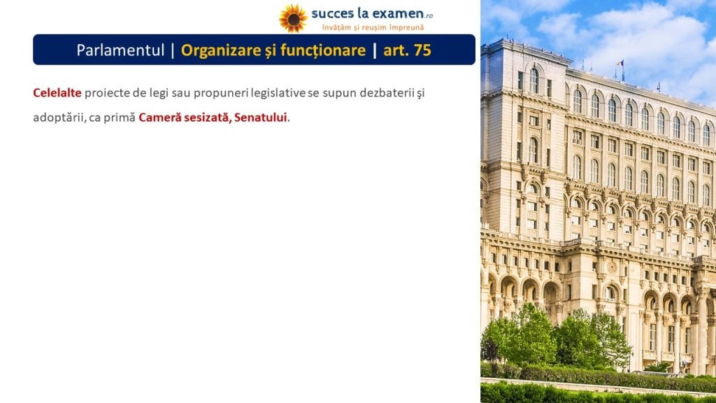 - Celelalte proiecte de legi sau propuneri legislative se supun dezbaterii şi adoptării, ca primă Cameră sesizată, Senatului.