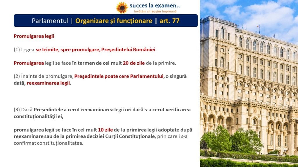 - promulgarea legii se face în cel mult 10 zile de la primirea legii adoptate după reexaminare sau de la primirea deciziei Curţii Constituţionale, prin care i s-a confirmat constituţionalitatea.
