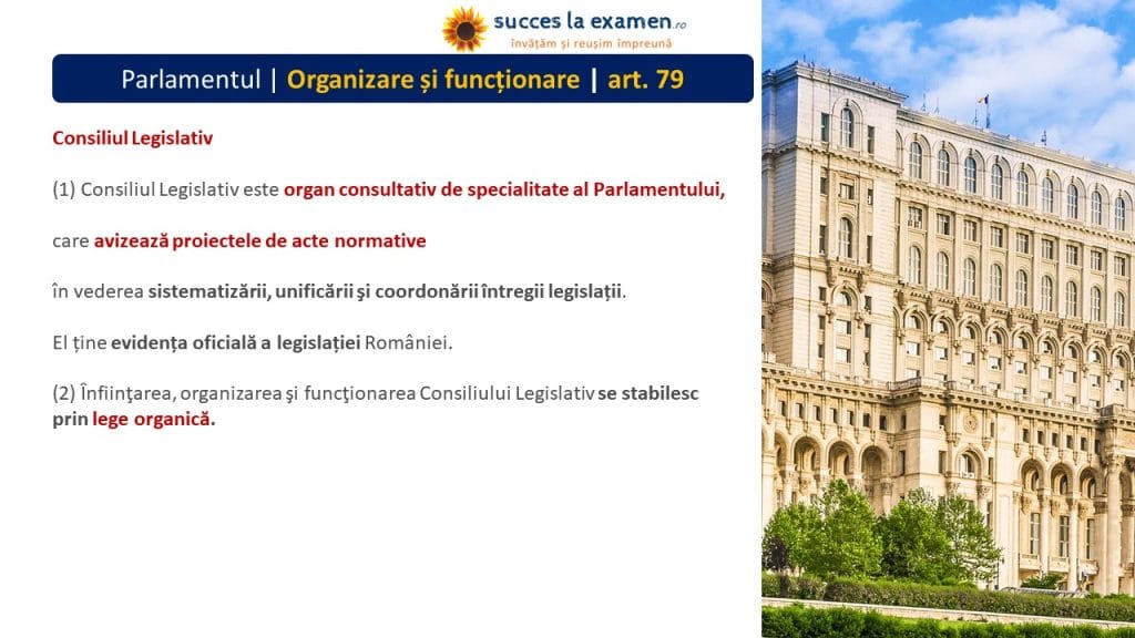 - articolul 79 alineatul (2) – Înfiinţarea, organizarea şi funcţionarea Consiliului Legislativ se stabilesc prin lege organică.,