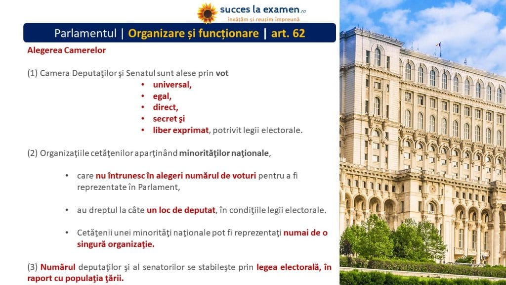 (1) CAMERA DEPUTAȚILOR și SENATUL sunt alese prin VOT UNIVERSAL, EGAL, DIRECT, SECRET și LIBER EXPRIMAT, potrivit legii electorale.