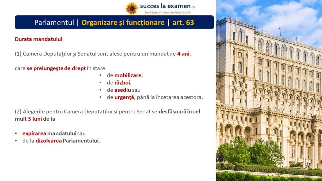 (1) CAMERA DEPUTAȚILOR și SENATUL sunt alese pentru un MANDAT DE 4 ANI, care se prelungește de drept în stare de MOBILIZARE, de RĂZBOI, de ASEDIU sau de URGENȚĂ, până la încetarea acestora.